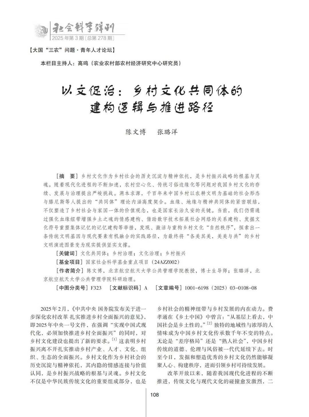 近日,北京航空航天大學(xué)人文社會科學(xué)學(xué)院(公共管理學(xué)院)陳文博教授、科研助理張璐洋在《社會科學(xué)輯刊》so米體育-NBAso米直播第3期發(fā)表《以文促治:鄉(xiāng)村文化共同體的建構(gòu)邏輯與推進路徑》一文